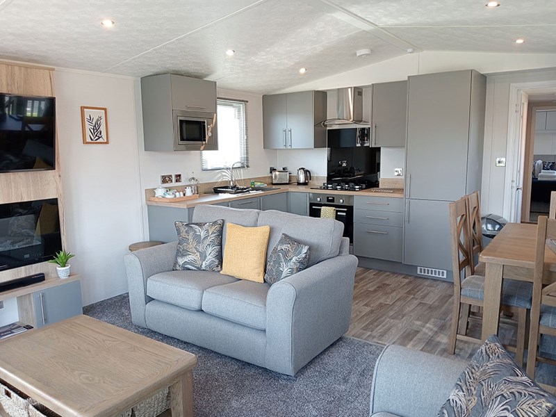 'Our beautiful Merlin lodge sits in a sought after spot on our lovely resort; affording beautiful views to the rolling hills beyond . Step out of your patio doors to the spacious decking area, with a Jacuzzi hot-tub , luxury outdoor dining furniture and enjoy being 'at-one' in this beautiful place. Beautifully appointed throughout with every modern convenience.